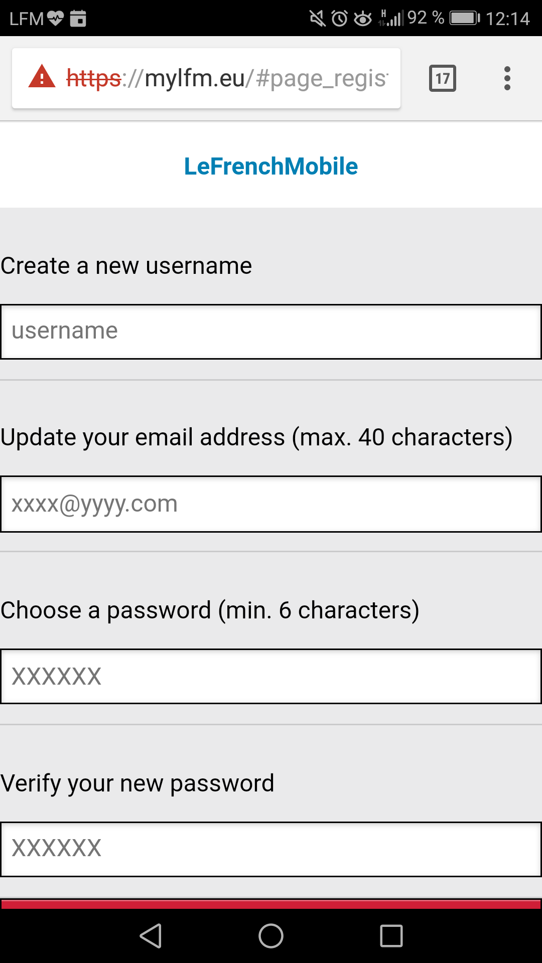 Once you go to mylfm.eu, from your device that has the LFM APN set, and is on the LFM network, you will see a register screen as shown below.